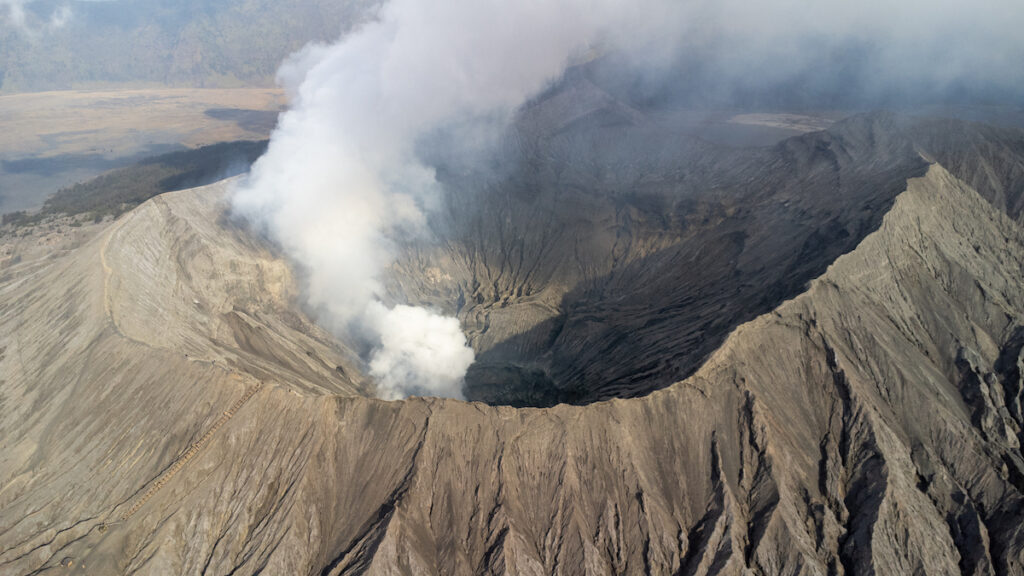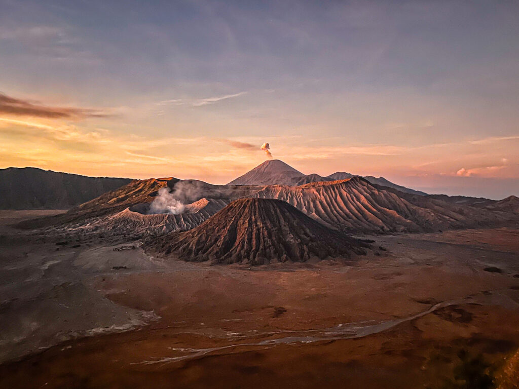Arrivés en haut, le spectacle nous laisse sans voix. À nos pieds, une immense dépression volcanique de laquelle ont surgit trois volcans, dont le Bromo, encore en activité.
